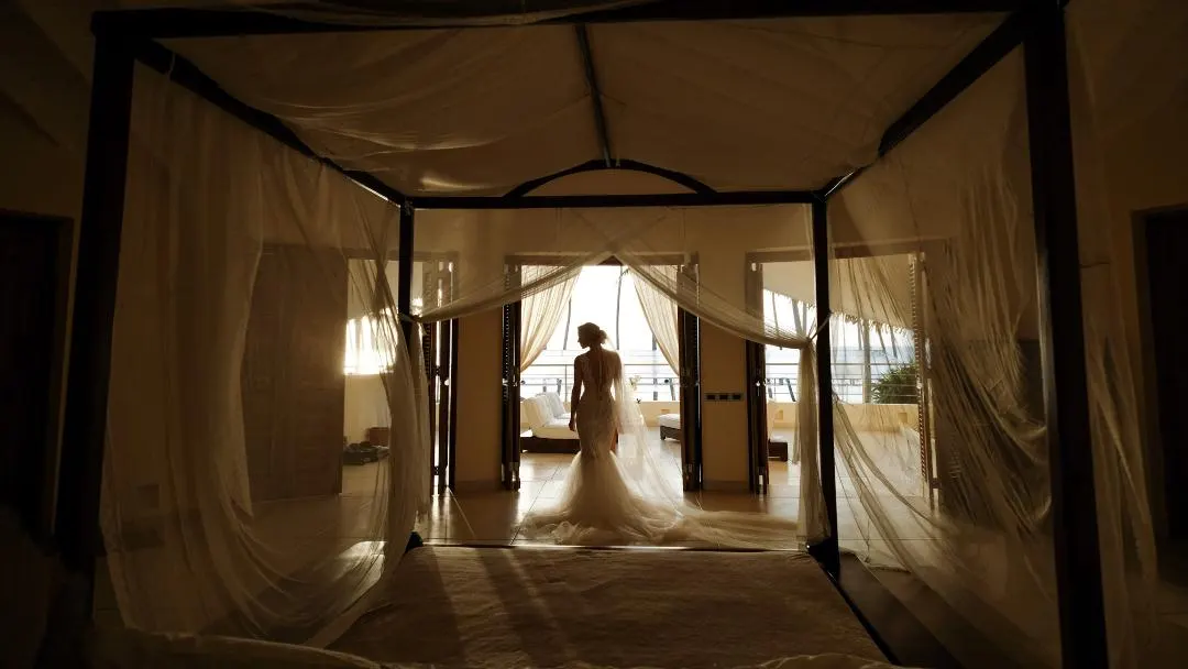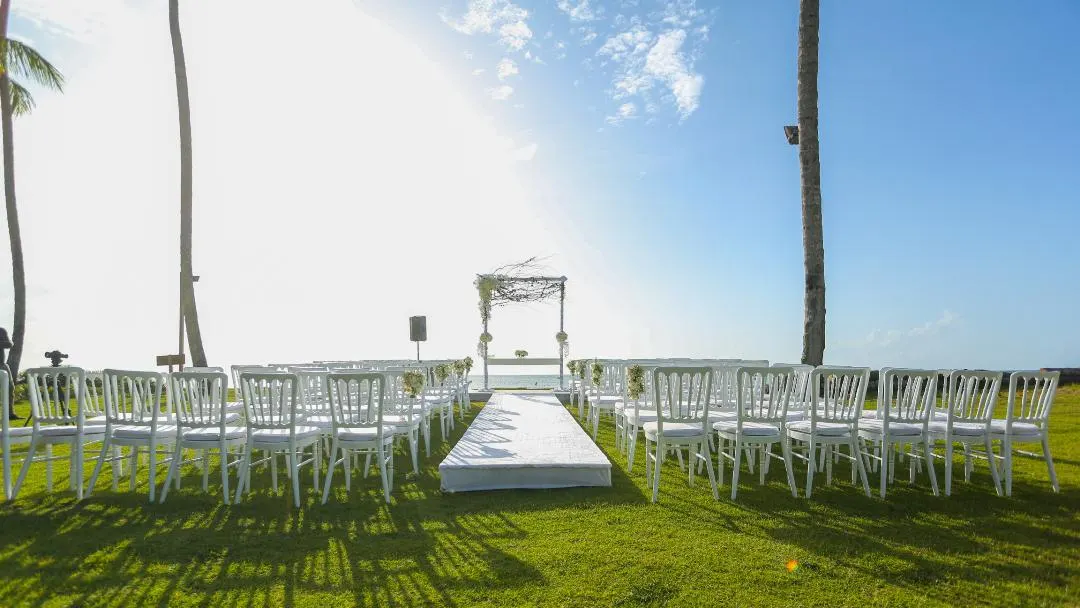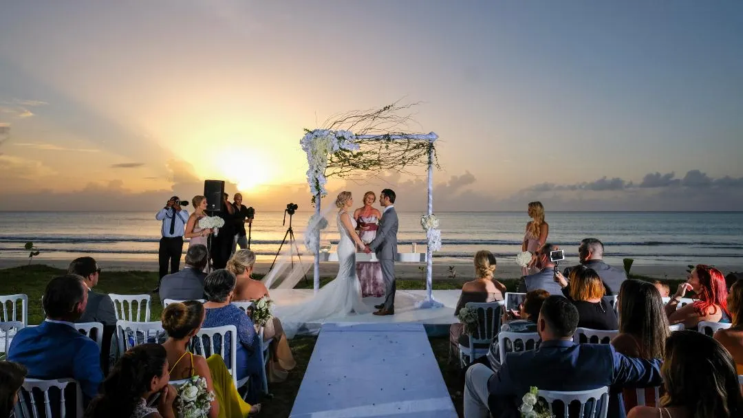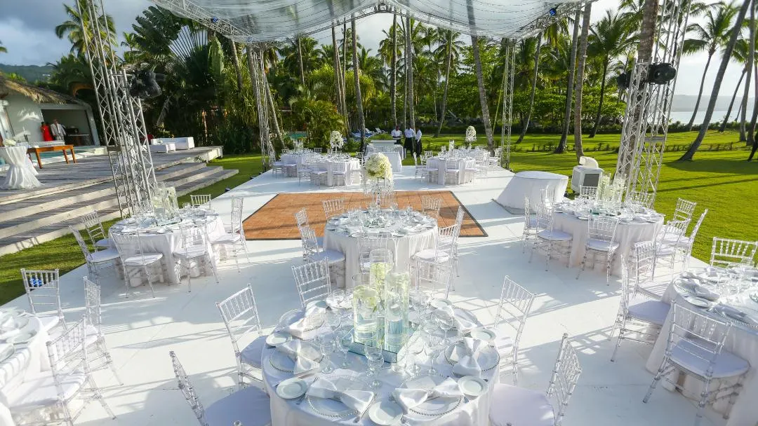 Eine traumhafte Hochzeitszeremonie im tropischen Garten einer Luxusvilla in Las Terrenas, mit Ausblick auf den glitzernden Atlantischen Ozean und einen wunderschönen, einsamen Palmenstrand. Diese Hochzeit startete an einem Donnerstag mit einem leckeren Willkommensdinner unseres Caterings, welches im palmengesäumten, tropischen Garten der Villa stattfand. Am Samstag war alles wunderschön mit weißen Blumen geschmückt, perfekt für eine Strandhochzeit in der Karibik. Die Hochzeitszeremonie fand bei Sonnenuntergang in einer traumhaft romantischen Atmosphäre statt.