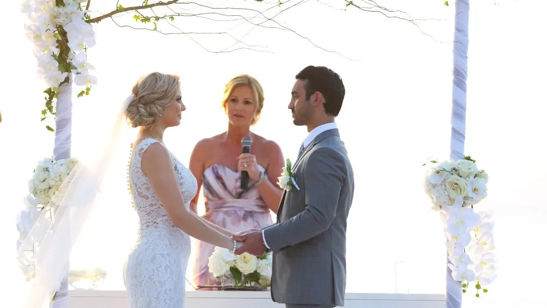 Das Brautpaar während ihrer wunderschönen Hochzeitszeremonie am Strand