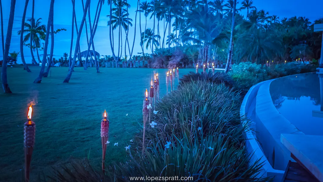 Als die Nacht hereinbrach, wurde der Garten wunderschön mit Fackeln beleuchtet.
