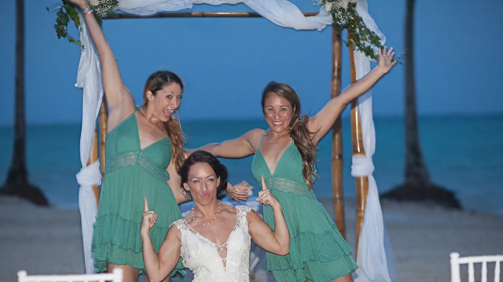 Die Braut und ihre Brautjungfern bei der Hochzeitsparty am Strand